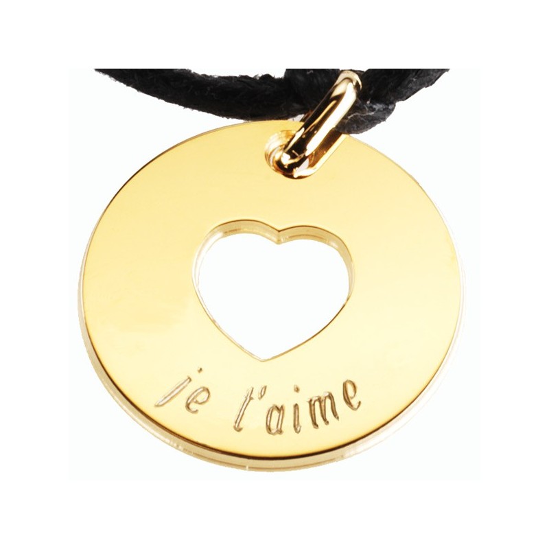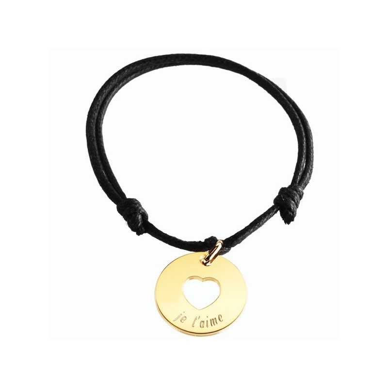 Ravissantes médailles ajourées d'un coeur.Personnalisez le bracelet "Accroche coeur" en choisissant le nombre de médailles, leur gravure et la couleur du cordon de votre choix.Matière : Plaqué or.Dimensions : diamètre 2 cm.