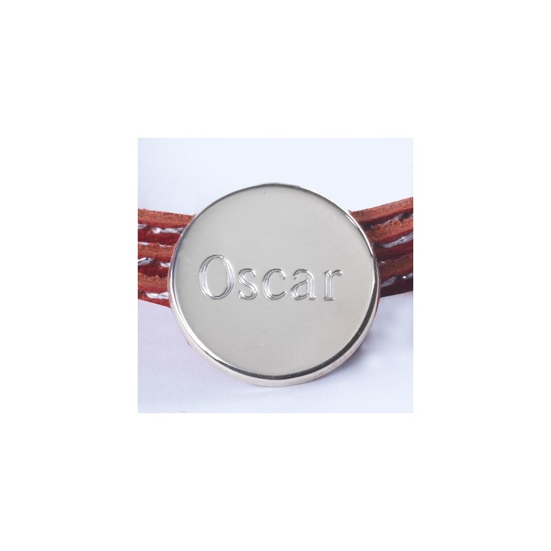 Bracelet en cuir surpiqué d'un fil argenté avec sa médaille en Argent.
