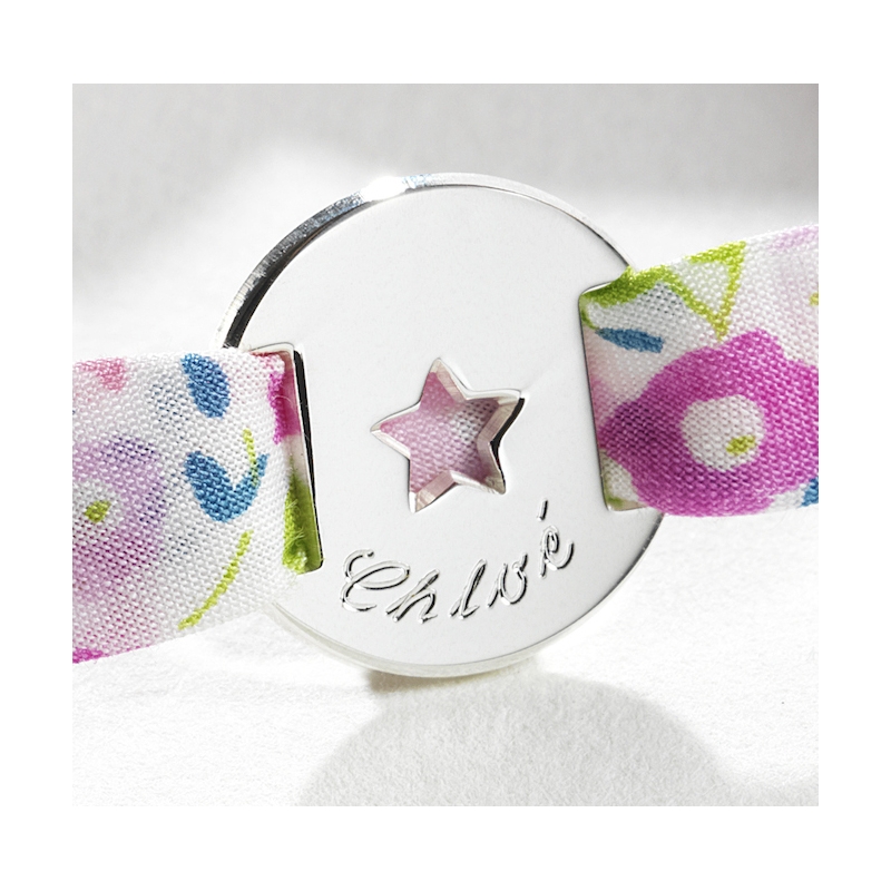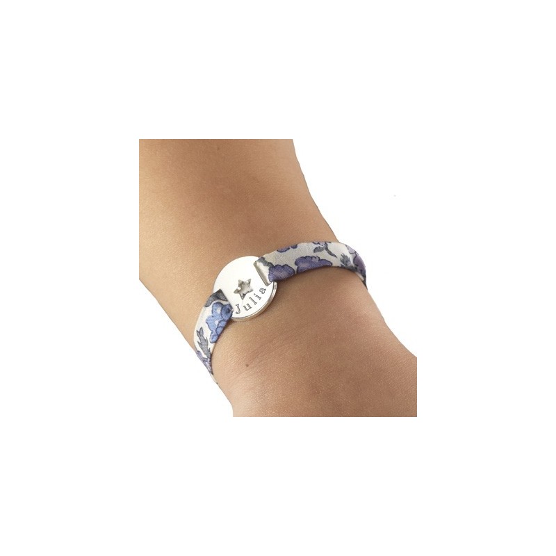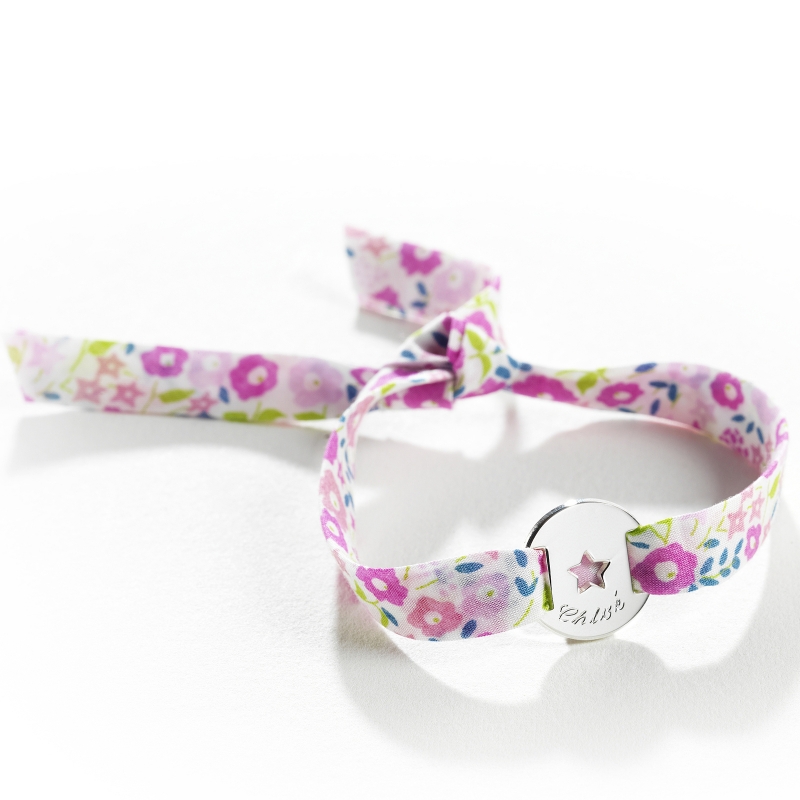 Adorable bracelet en Liberty. Personnalisez votre bijou par une gravure et le Liberty de votre choix. Le bracelet se ferme par un noeud et s'adapte à toutes les tailles.Matière : Argent et Liberty.Dimensions : diamètre 1.5 cm.