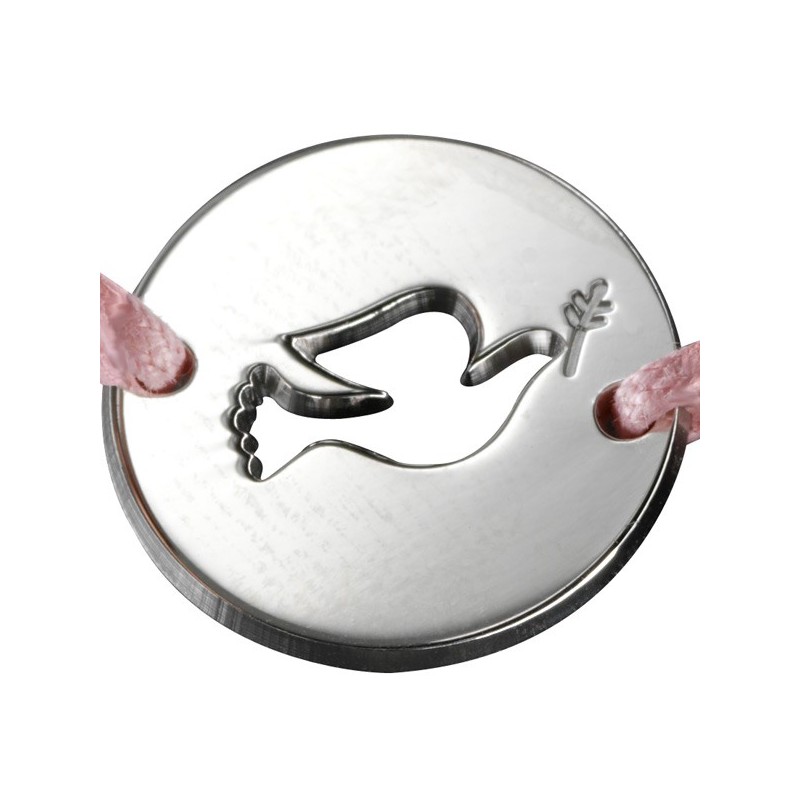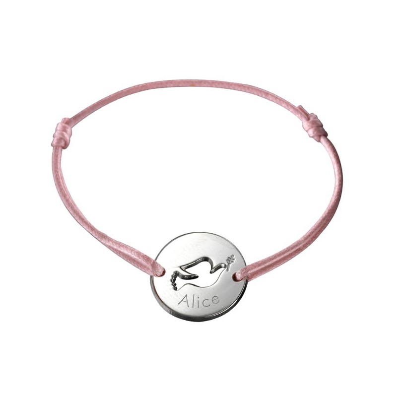 Mon tout premier bijou! Adorable bracelet en argent aussi bien porté par bébé dès sa naissance que par ses frères et soeurs. Personnalisez le bracelet Mini jeton colombe par une gravure et la couleur du cordon de votre choix.