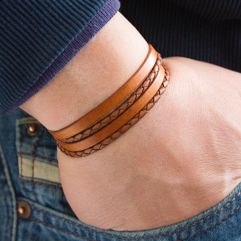 Bracelet cuir double tour cognac personnalisé - Cadeau idéal pour papa