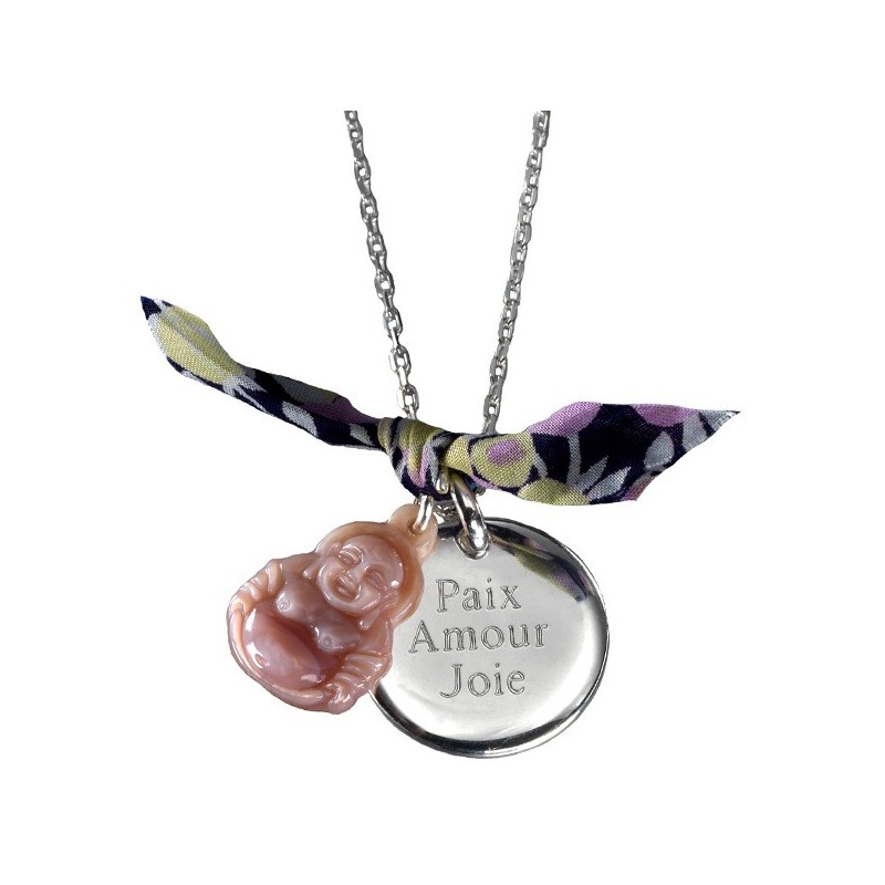 Le Pendentif Buddha est monté sur une chaîne en Argent avec un ruban en Liberty et une nacre "Buddha".
