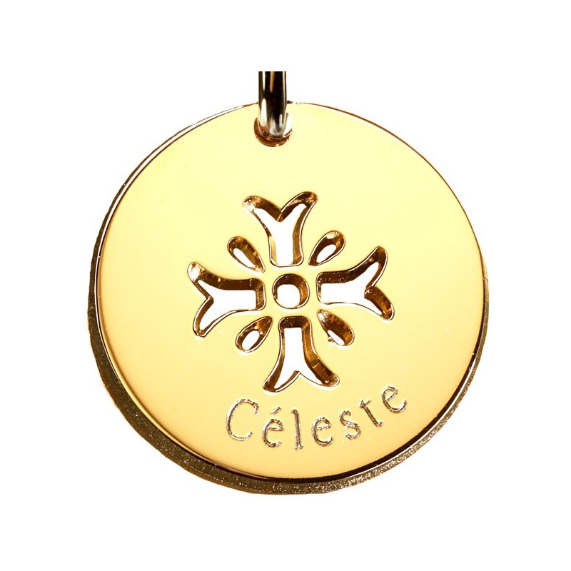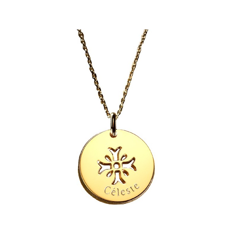 Médaille croix Mimosa ajouré d'une magnifique croix en plaqué or.Personnalisez le pendentif "Croix Mimosa" par une gravure.Matière : Plaqué or.Chaîne : 42 cm.Diamètre : 2 cm.