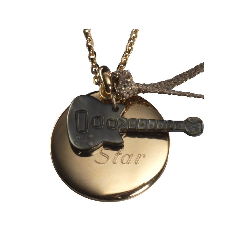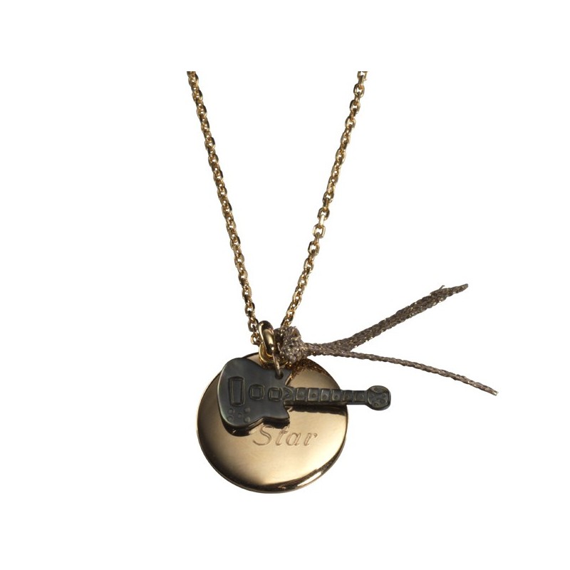Le Pendentif Guitare est monté sur une chaîne en plaqué or avec un ruban doré et une guitare en nacre.