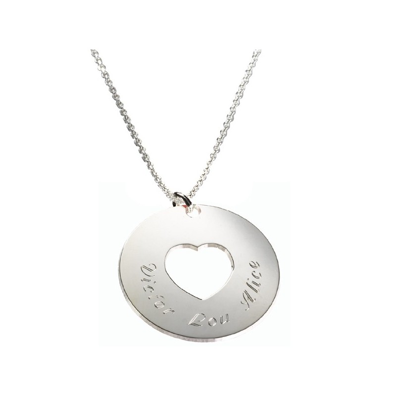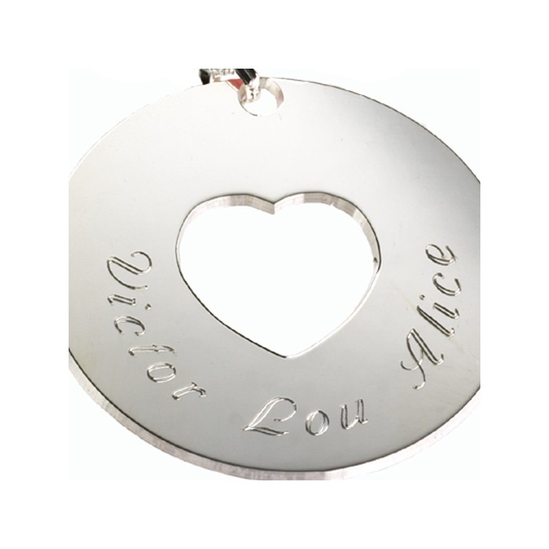 Elégant et symbole de tendresse le pendentif Message du Coeur fera le bonheur de toutes les mamans.Personnalisez votre pendentif par une gravure et la couleur du cordon de votre choix.Matière : Argent.Chaîne : 50 cm.Diamètre : 3.3 cm.