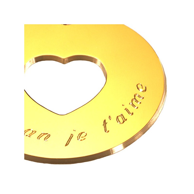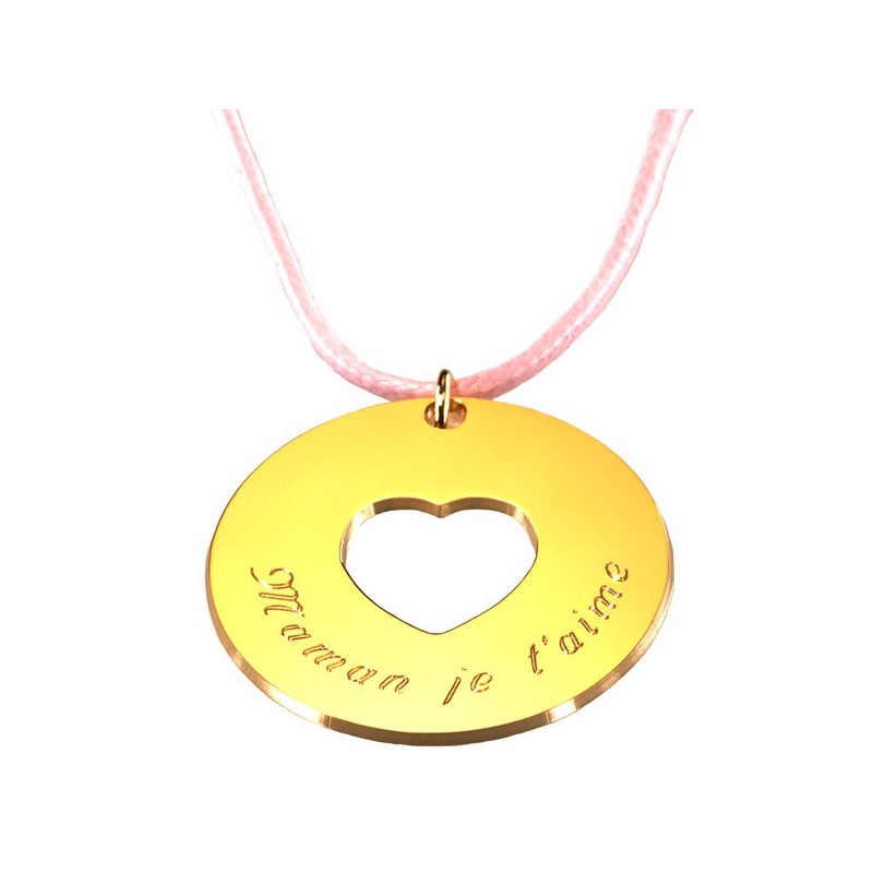 Elégant et symbole de tendresse le pendentif Message du Coeur fera le bonheur de toutes les mamans.Personnalisez votre pendentif par une gravure et la couleur du cordon de votre choix.Matière : Plaqué or.Diamètre : 3.3 cm.