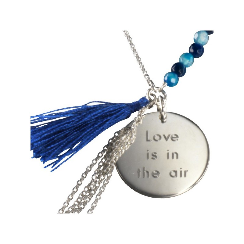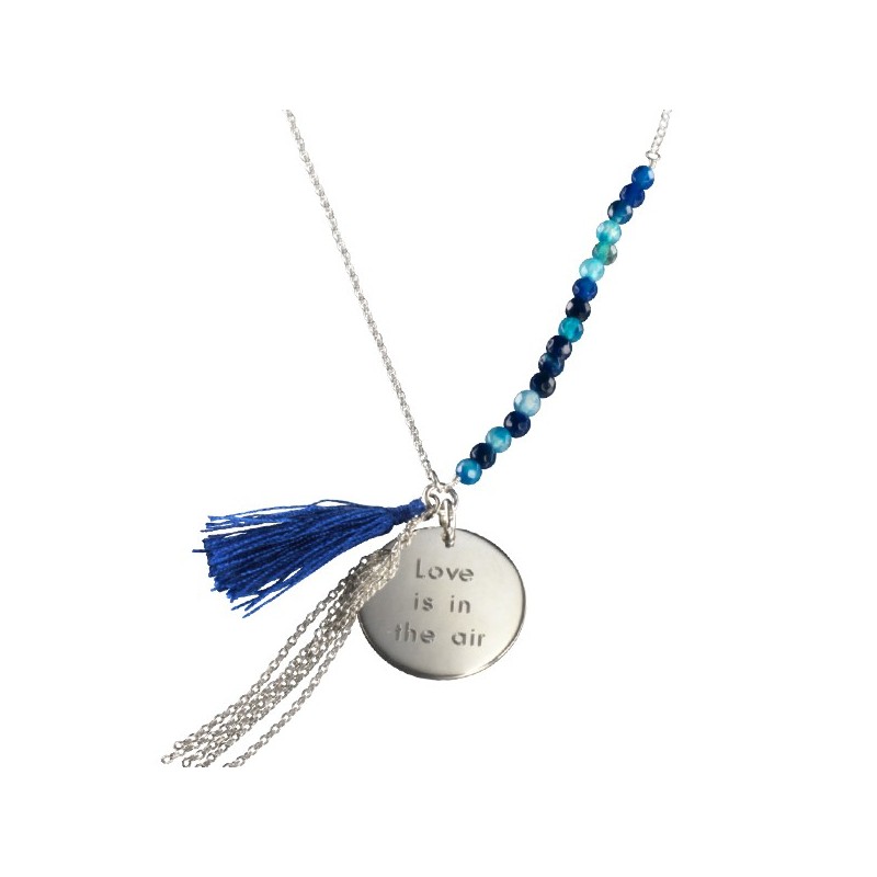 Ethnique et chic le sautoir Bahia personnalisé est un hymne au voyage. Monté sur une chaîne en argent, le sautoir est composé d'Agathes bleues, d'un pompon et d'une médaille personnalisée par une gravure de votre choix.