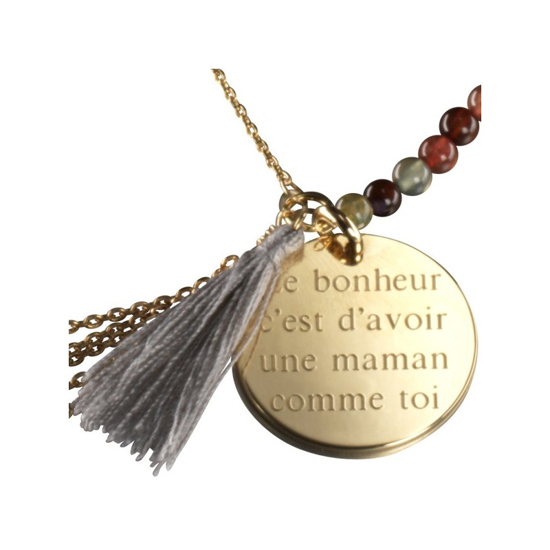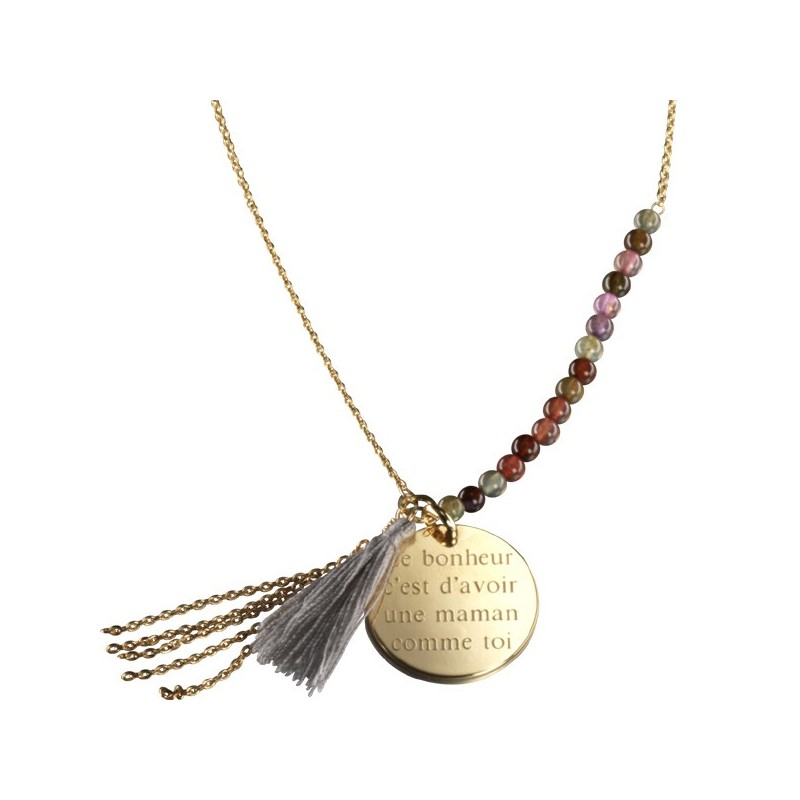 Ethnique et chic le sautoir Bahia personnalisé est un hymne au voyage. Monté sur une chaîne en plaqué or, le sautoir est composé de Tourmaline, d'un pompon et d'une médaille personnalisée par une gravure de votre choix.