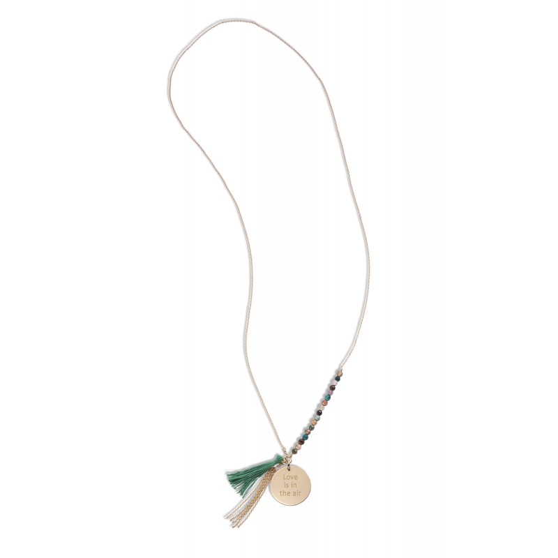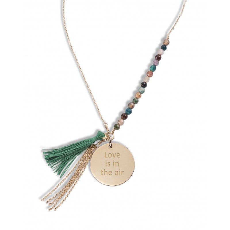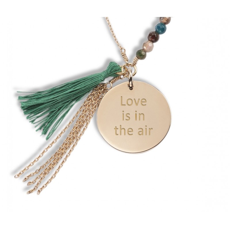 Ethnique et chic le sautoir Bahia personnalisé est un hymne au voyage. Monté sur une chaîne en plaqué or, le sautoir est composé d'Agathes vertes d'un pompon et d'une médaille personnalisée par une gravure de votre choix.