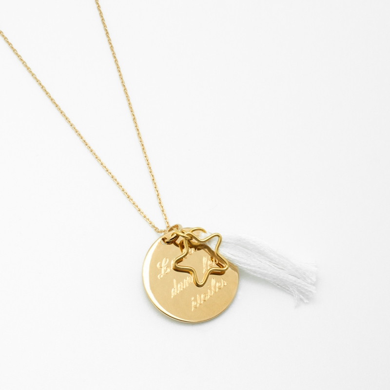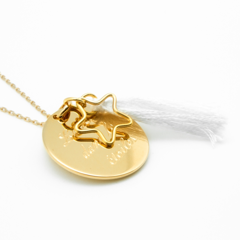 La médaille en plaqué or est personnalisée avec la gravure de votre choix : mots doux, prénoms, dates…