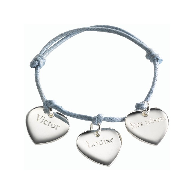 Personnalisez le bracelet « Petits Coeurs » en choisissant le nombre de Coeurs, leur gravure et la couleur du cordon de votre choix.